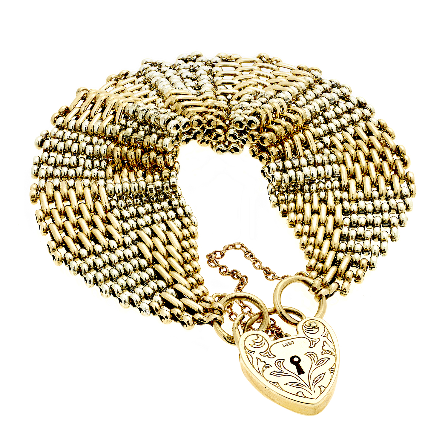 9ct yellow gold solid 8 bar gate bracelet with padlock and safety chain attached. Fully reconditioned.