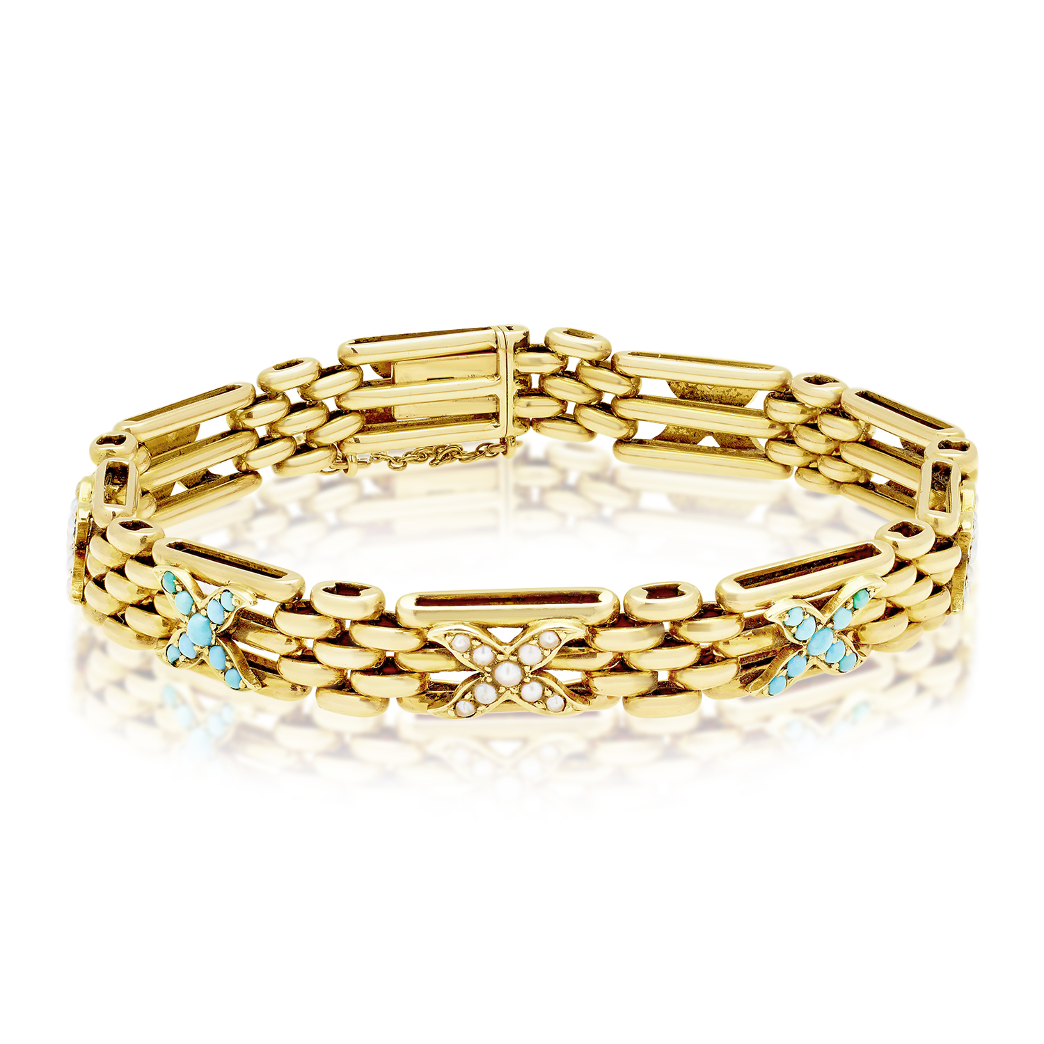 15ct yellow gold Victorian turquoise and seed pearl gate style bracelet
